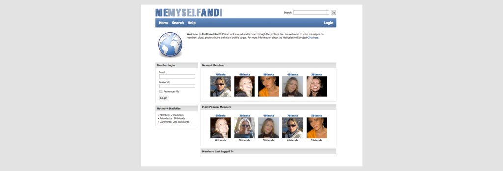 The explosion of social networking websites allows us a new way to relate to each other. Such is the conventional wisdom. If technology is our mirror, what sort of a face is looking back at us from the surface of the Internet? MeMyselfAndI is a virtual place where the subjective self went supernova. This appropriating gesture gives birth to semi-autonomous entities: the profiles alienated from their source and struggling for their own boundaries.